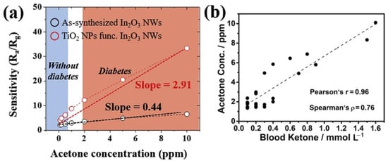 (a) The “healthy” and “diabetes” regions in an In2O3 nanowire sensor and a TiO2-nanoparticles-functionalized In2O3 nanowire sensor (adapted from [27]). (b) Exhaled acetone concentration vs. blood glucose concentration of diabetic patients from the Second Hospital of Jilin University (adapted from [30]).
