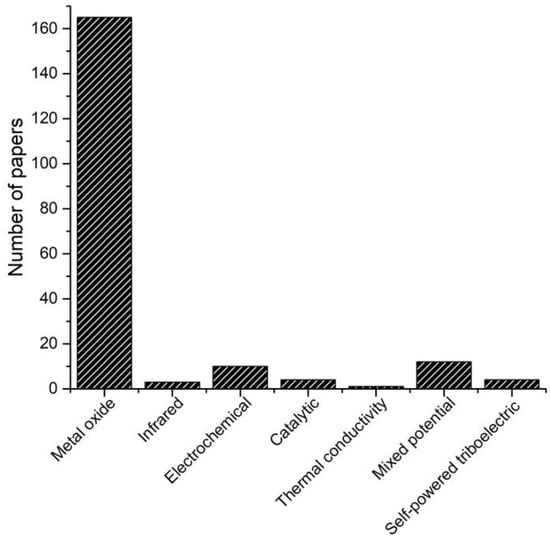 Although there are many types of gas sensors available, in this review, the focus will be on MOx-type gas sensors due to their importance in the detection of toxic or carcinogenic gases, among which a number of VOCs have been identified. For example, acetone toxicity affects almost every system in the body, including the nervous, respiratory, cardiovascular, and endocrine systems [70]. Acetone is harmful to health, and its inhalation can cause irritation in the eyes, nose, and throat. A short, five-minute exposure at 300–500 ppm may be mildly irritating to humans. In high concentrations, it can cause dry mouth, fatigue, headache, nausea, dizziness, muscle weakness, loss of coordinated speech, and drowsiness. Ingestion can cause headaches, dizziness, and dermatitis [70]. Therefore, acetone detection encompasses a wide range of purposes—for example, the need to monitor the concentration of acetone in the environment for health and in the workplace for safety, as well as the provision of an alternative to the conventional diagnosis of diabetes. These topics have been the subject of many publications, where 83% of those are related to metal oxides (Figure 3). Therefore, in the main, only the latest results will be shown and discussed in the following sections.