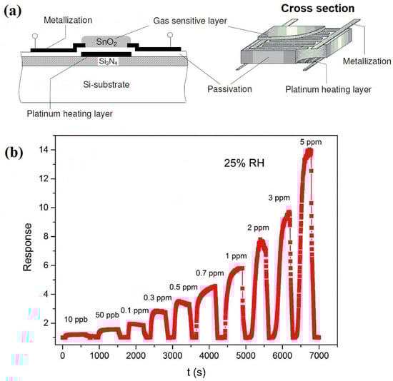 The operation of MOx-type gas sensors is based on the change in conductivity under the influence of reducing gases (H2, H2S, CO, NH4, ethanol, CH4, acetone) or oxidizing gases (O2, O3, NOX, CO2, SO2). Since temperature—generally referred to as the operating temperature or optimum operating temperature—is a factor that influences the behavior of the sensing material (i.e., when the sensor response is higher), these gas sensors usually include a heating element. The classical fabrication of a metal oxide gas sensor uses powder metallurgy (pellet or tube form) or thick or thin film technology [36,77]. In more advanced methods, a microstructured silicon substrate is applied as the base for the metal oxide (sensitive material) and heater. Due to the limited space to be heated and the shorter distance between the heating layer and the sensitive surface layer, the required heating power of microstructured sensors is lower than that of conventional sensors [78]. The design of a metal oxide gas sensor in microstructured silicon technology is illustrated in Figure 4a.