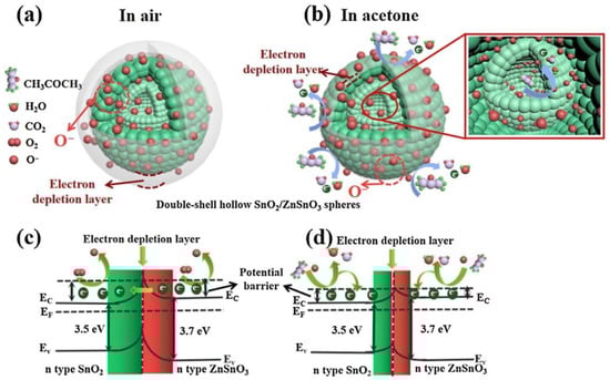 Schematic illustration of the sensing mechanism of a double-shelled hollow SnO2/ZnSnO3 composite microspheres-based sensor to acetone [40].