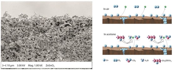 Scanning electron microscopy images and illustration of the gas-sensing mechanism of the ZnSnO3 sensor (adapted from [44]).