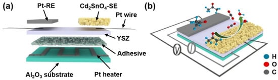 (a) Structure of the planar-type YSZ-based sensor and (b) schematic diagram of the measurement [30].