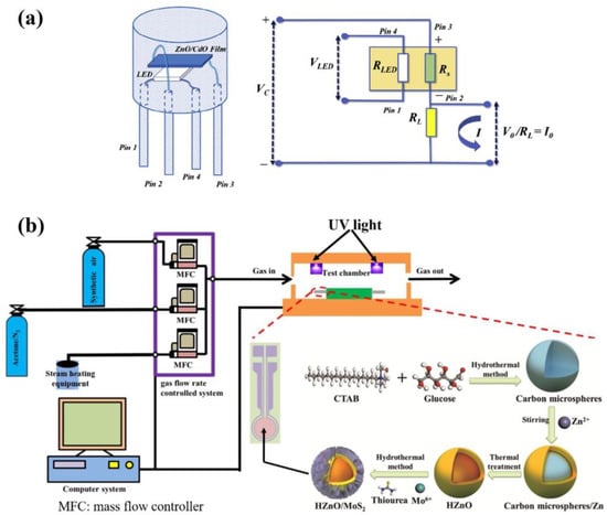 Diagram of (a) ZnO/CdO heterostructure sensor device and equivalent circuit (adapted from [60]); (b) gas-sensing test system and fabrication processes of HZnO/MoS2 core–shell heterogeneous structures (adapted from [61]).
