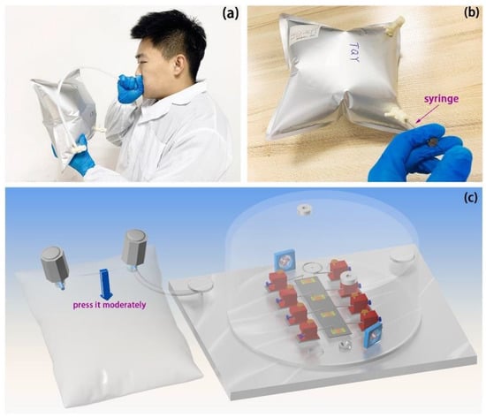 (a,b) The process of obtaining the simulated exhaled gas of diabetic patients. (c) A schematic diagram depicts how the simulated exhaled gas of diabetic patients is tested [46].
