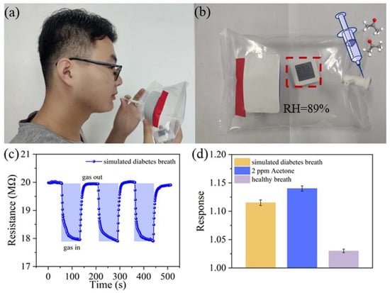 Investigation of the breath gas analysis of a Co3O4/CdS sensor. (a) The breath of a healthy experimenter is collected with an air bag. (b) The breathing of diabetic patients is simulated by injecting 2 ppm acetone into the exhaled breath of healthy people. (c) The response curve of the sensor in the environment of the simulated breath of diabetic patients. (d) The response value of the sensor tested upon exposure to simulated diabetes breath, 2 ppm acetone, and healthy breath [63].