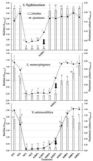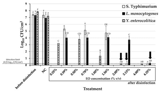 Biofilm populations (log10 CFU/cm2) found in the wells of the 96-well microtiter plates for the three bacterial strains (S. Typhimurium, L. monocytogenes, and Y. enterocolitica) before and after disinfection with the T. capitatus EO. For each bacterial strain, the EO was tested in five different concentrations, two-fold dilutions ranging from 0.39 to 6.25% v/v for S. Typhimurium and L. monocytogenes strains, and from 0.25 to 4.00% v/v for Y. enterocolitica strain. The biofilm population of the negative disinfection control (NC; sterile distilled water also containing 10% v/v ethanol) is also shown. The bars represent the mean values ± standard deviations. Mean values followed by different superscript uppercase letters (A–F) differ significantly (p < 0.05). For each bacterial strain, the MBEC of the EO (resulting in more than six log reductions of its biofilm population with respect to that of the NC) is indicated with the vertical arrow.