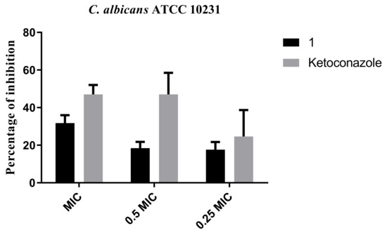 Percentages of inhibition of C. albicans ATCC 10231 biofilm formation by compound 1 and Ketoconazole.