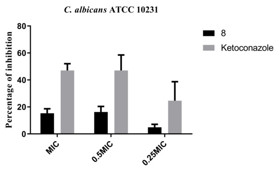 Even twice as low concentrations (0.5 MIC) of compound 8 limited the biofilm forming ability and induced more than 16% inhibition in C. albicans. The impact on the fungal biofilm was less profound and the 0.25 MIC concentration of 8 was able to reduce the biofilm formation byless than 5% (Figure 3).