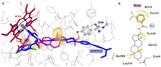 (A) Superposition of compound 8 (magenta) and ketoconazole (blue) in lanosterol 14α-demethylase of C. albicans (CYP51ca). (B) Docked conformation of the most active compound 8 in lanosterol 14α-demethylase of C. albicans (CYP51ca). Red dotted arrows indicate H-bond, blue arrows aromatic interactions and yellow spheres hydrophobic interactions.