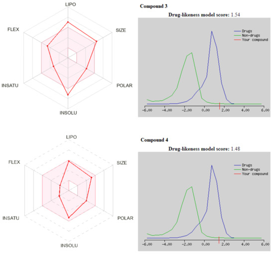Drug-likeness model and bioavailability radar of the compounds 3 and 4. The pink area represents the optimal range for each property for oral bioavailability, (Lipophilicity (LIPO): XLOGP3 between −0.7 and +5.0, Molecular weight (SIZE): MW between 150 and 500 g/mol, Polarity (POLAR) TPSA between 20 and 130 Å2, Solubility (INSOLU): log S not higher than 6, Saturation (INSATU): fraction of carbons in the sp3 hybridization not less than 0.25 and Flexibility (FLEX): no more than 9 rotatable bonds.