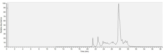 The lipopeptide concentration in the ferment broth of each sample was carried out after calibration with surfactin standard by calculating the integrated peak areas of the total ion chromatograms (TIC) measured in SIM mode set to the m/z values of the sodiated precursor ions (Figure 1).