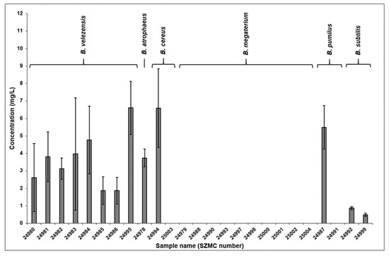 The comparison of the results of the quantitative measurements is shown in Figure 2. Observing the diagram, it can be seen that none of the B. megaterium strains examined in this study produced surfactin at all. The extracted ferment broths of the five B. velezensis samples contained surfactin in the 2–5 mg/L concentration range, except for strain SZMC 24995 which bore the highest surfactin content among the examined samples by almost reaching 7 mg/L. The B. atrophaeus strain SZMC 24978 possessed biosurfactant production properties similar to most of the aforementioned strains. As a peculiar result in the case of B. cereus, the SZMC 24994 strain produced surfactins in one of the highest quantities among the examined samples, although, the ferment broth of the SZMC 25003 strain did not contain the observed lipopeptides. Results were similar in the case of the B. pumilus samples, in which strain SZMC 24991 did not produce the examined molecules, while strain SZMC 24987 possessed surfactins in the third highest concentration in its ferment broth. The quantity of biosurfactants in both B. subtilis strains were detected below 1 mg/L.