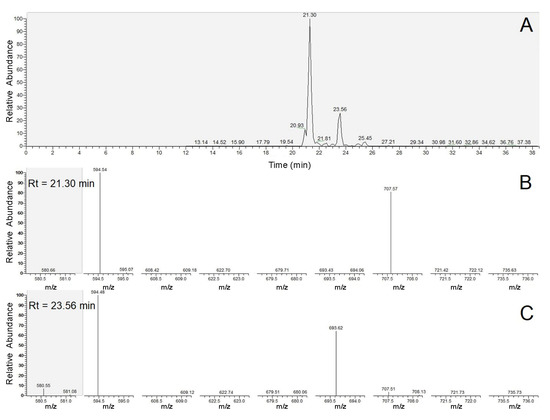 Identification of the different surfactin molecules was carried out based on the mass differences of the precursor ions and the y6 + H2O internal fragment ions as well as the m/z values of the overlapping peaks of y6 + H2O and y6b6 + H2O fragment ions. An example for the evaluation process is shown in Figure 3. Observing the MS/MS spectra of the two peaks, the first peak at the retention time of 21.30 min definitely belongs to a [Sur] variant, while the second one at Rt = 23.56 min marks the presence of a [Val7] surfactin molecule due to the corresponding m/z values of y6 + H2O and y6b6 + H2O fragment ions. Subtracting the m/z values of the y6 + H2O fragment ions from those of the sodiated precursor ions, their mass differences indicate the two homologues to be C12 and C13, respectively; thus, the two molecules can be identified as C12-[Sur] and C13-[Val7] simply from these acquired data.