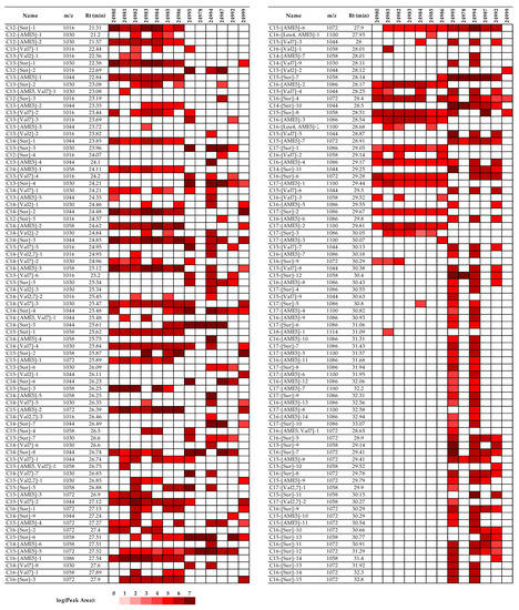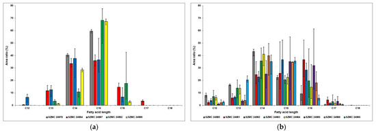 Results of the B. velezensis strains show that the area ratios of C16 molecules are more proportionate to their C14 and C15 counterparts; in the SZMC 24981 strain, these were observed in the highest relative amounts (Figure 6). This is also the only sample in which C18 homologues were detected, although only in a mere 0.05% ratio, while all the other fatty acid chain lengths between 12 and 17 carbon atoms were present in all strains.
