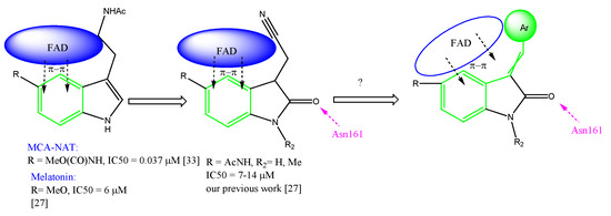 Previously, we demonstrated that 2-oxindole derivatives can act as NQO2 inhibitors and bind to NQO2 binding site, analogous to melatonin [11,27]. In this work we report the development of new oxindole-based NQO2 inhibitors containing additional arylidene moiety in order to amplify the π–π stacking interactions with the FAD cofactor in the active center of the enzyme (Figure 1).