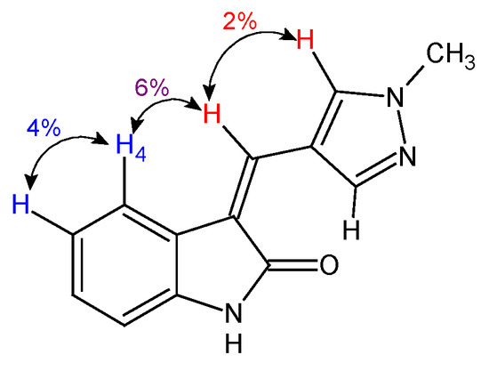 We found Z-isomer to be predominant in some pyrazole derivatives. The NOE experiment for 3-(1-methyl-1H-pyrazol-4-ylmethylidene)-2-oxindole 41, obtained as a single isomer, showed the interaction of the double bond proton with the proton H4 of the oxindole fragment (Figure 3), indicating their cis configuration.