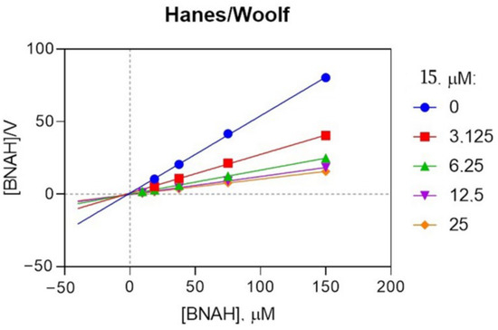 The mechanism of NQO2 inhibition by one of the lead compounds, 15, was elucidated using a kinetic experiment (Figure 4 and Figure S22). The reaction rate was monitored under a range of inhibitor (0–25 µM) and BNAH substrate concentrations (9.375–150 µM). We found that both maximum rate Vmax and Michaelis constant Km decreased while Vmax/Km ratio increased at higher BNAH concentrations. Hence, 15 behaves as a typical mixed-type (noncompetitive) inhibitor.