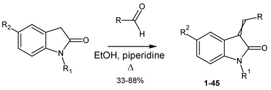 2-oxindole (1 eq.) and the corresponding carboxaldehyde (1 eq.) were dissolved in 2–5 mL of solvent and 60–120 µL of piperidine was added. The reaction mixture was refluxed until the parent oxindole disappeared (monitored by TLC). The reaction mixture was then cooled down to room temperature. If a precipitate formed, it was filtered off and washed with ethyl acetate and diethyl ether and dried. If no precipitate appeared, the solution was concentrated in a vacuum and the resulting product was washed with ethyl acetate and diethyl ether and dried. The following compounds were obtained according to this procedure, with the reactions carried out in ethanol: