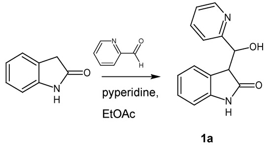 - From 0.100 g (0.8 mmol) of 2-oxindole, 0.08 mL (0.8 mmol) of 2-pyridinecarboxaldehyde and 60 µL (0.7 mmol) of piperidine with ethyl acetate as solvent the beige powder (0.088 g, 49%) was obtained. According to 1H NMR the ratio of two diastereoisomers of 1a and the final condensation product 1 is 6.92:4.17:1 respectively.