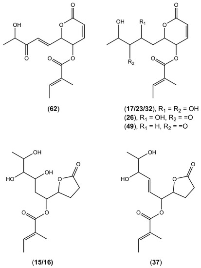 The UHPLC-HRESIMS analysis of extracts from Diaporthe isolates led to the annotation of several compounds from the polyketide group—pyranones such as, dihydrohydroxyphomopsolide B isomers I–III (17, 23, 32), dihydrophomopsolide A (49), dihydrohydroxyphomopsolide A (26), and furanones such as phomopsolidone B (37) and dihydrohydroxyphomopsolidone B isomers I and II (15, 16) (Figure 1). These compounds were tentatively identified based on the high-resolution mass of the precursor ions and the fragments generated via common fragmentation pathways in positive ionization mode. Namely, the loss of one or two water molecules (−18 Da or 36 Da), followed by the loss of a tiglic acid (2-methylbut-2-enoic acid) residue (-C5H8O2), giving intense fragment ions with m/z 179 or 197 for compounds 17, 23, and 32 ion at m/z 177 for compounds 26 and 49, and m/z 181 for compounds 15, 16, and 37, was observed (Table 2). Phomopsolides are common secondary metabolites derived from Diaporthe [25]. They were initially isolated from Phomopsis oblonga, a fungus that provided some protection against elm bark beetle infestations [37]. They have been proved for their antibacterial activity against Staphylococcus aureus [38]. Moreover, phomopsolide A/C (62), from the endophytic Diaporthe sp. AC1 from Artemisia argyi, was proved to inhibit the growth of Fusarium graminearum, F. moniliforme, Botrytis cinerea, and Verticillium dahliae, indicating that the compound may have a broad spectrum of antifungal activity [29].
