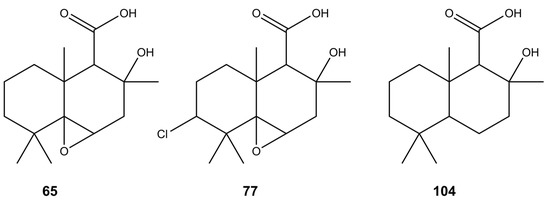 Drimane-type sesquiterpenoids are a large group of compounds that have been found in plants and fungi, exhibiting various biological activities [60,61]. During the research conducted by Zang et al. [62] and Chen et al. [63], a variety of new drimane-type metabolites, including diaporols B–I (104), Q, and R, have been isolated from the mangrove endophytic Diaporthe sp. [62,63]. Furthermore, two drimane-type sesquiterpenoids, named altiloxins A (65) and B (77) (Figure 4), showing phytotoxic activity on the lettuce seedlings were obtained from Phoma asparagi [64]. Considering the fragmentation spectra of compounds 65, 77, and 104, in the Diaporthe isolates studied, we determined the presence of a number of their derivatives—dihydro-altiloxin A (54), dihydro-altiloxin B (72), hydroxy-altiloxin A isomers I and II (19, 22), hydroxy-altiloxin B isomers I and II (33, 50), and deoxy-altiloxin A (102).