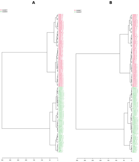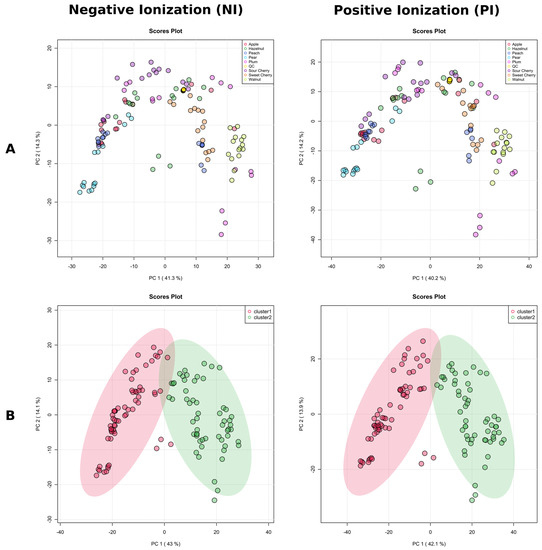 To avoid biased group assignment of the PCA plots, samples were statistically assigned into 2 clusters (chemotypes) based on the k–means clustering algorithm in NI mode, and the groups generated by the k–means clustering algorithm in the negative mode were assigned to the positive mode (Figure 6B). The clustering of the data was easily visualized in both ionization modes, and confirmed by clusters obtained separately by HCA (Figure 7A,B). The first five PCs explained 75.1% of the variance in NI and 75.4% in PI modes, and 57.1% of the total variance was projected in the first two PCs in NI, while 56.0% in PI, which suggested the similar quality of data obtained in both ionization modes. Indeed, the PCA score plots showed similar patterns with specific host plants (understood as metadata) grouped together (pear, sweet cherry, and walnut), while the rest were much more dispersed, and there were no clear associations between the metadata and the groups in the PCA. We decided to use NI mode for further work due to the lower complexity of LC-MS data (high amount of in-source collision-induced dissociation in PI).