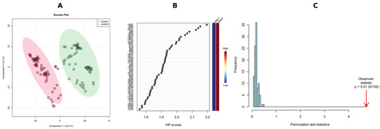 To validate the k–means/HCA model and to identify the features responsible for the classification, we performed a supervised PLS-DA analysis, and overall, 52.1% of the total variance was displayed on the first two principal component axes of the PLS-DA score plot (Figure 8A), with R2X = 0.946 and Q2 = 0.924 calculated from the first three components via a 10-fold cross-validation method, with Q2 as the measured performance. Since PLS-DA tends to overfit data, the model was validated to understand whether the separation is statistically significant or is due to random noise. This hypothesis was tested using the permutation test—separation distance (B/W), with 100 permutations with observed statistics having a p < 0.01 (Figure 8C).
