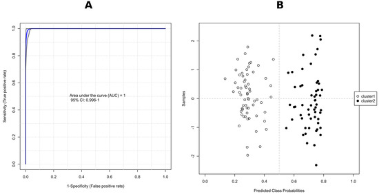 Potential variables to separate clusters 1 and 2 in the dendrogram were identified as potential biomarkers using VIP values which estimate the importance of each variable in the projection used in a PLS-DA model. The greater-than-one rule is usually considered for detecting the descriptors with the greatest importance in the projection. However, we decided, due to a large number of significant metabolites (>300), to use VIP scores > 1.8 (Figure 8B). The peak intensity ratios were also subjected to an unpaired non-parametric test (Wilcoxon rank-sum test, also known as the Mann–Whitney U test) within MetaboAnalyst, and false discovery rates (FDR < 0.05) were calculated to discover if those features are significantly different between cluster 1 and 2. A large fold change (FC > 10) between the two putative chemotypes was also considered a selection criterion, with FC > 100 indicating the presence/absence of the feature in question. As a result, 43 features meeting these conditions (VIP = 2.20–1.81, FDR adj. p-value = 3.23 × 10−19–4.71 × 10−18, FC = 348–19) were selected (Table 3) for receiver operating characteristic (ROC) analysis in order to assess their potential as chemotaxonomical biomarkers. ROC curves are used to evaluate classification and prediction models in bioinformatics. They are often summarized in a single metric known as area under the curve (AUC), where AUC = 1.0 indicates an excellent classifier and AUC = 0.5 means the classifier has no practical utility [74]. In this regard, we calculated the AUC for each selected candidate biomarker, and the AUC values obtained ranged from 0.972 to 1.000 (Table 3). Furthermore, to consider factors other than genetics, i.e., host plant, year of strain isolation or storage time, a combination of multiple individual markers must be considered into a single multivariate model, providing improved levels of discrimination and confidence. To this end, we applied the PLS-DA model to combine our 43 selected markers to obtain the AUC (Figure 9A), and predicted the classification probability into each chemotype (Figure 9B). The performance of this model was tested using a balanced Monte-Carlo cross-validation procedure, and as a result the average accuracy based on 100 cross-validations was 0.991.