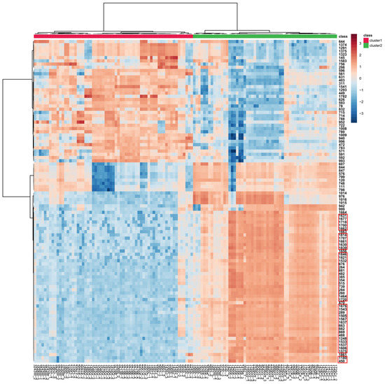 Hierarchical clustering with the heat map generated from the top 100 tentatively identified metabolites present in the tested Diaporthe isolates, according to t-tests, using Pearson distance for similarity measure and Ward’s linkage algorithm for clustering. Clusters were grouped based on the HCA/k–means analyses shown in Figure 6B and Figure 7. Cell colors indicate relative concentration values as high (dark brown) or low (dark blue), with samples in columns and features (MS DIAL ID in NI) in rows. Features from Table 3 are enclosed in red rectangles.