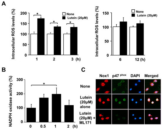 2.3. Lutein Increases ROS Levels and NADPH Oxidase Activity in AGS Cells