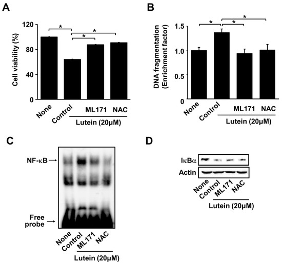 2.4. ML171 and NAC Inhibit Lutein-Induced Increase in ROS and Cell Death in AGS Cells