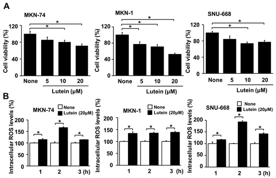 2.5. Lutein Decreases Cell Viability, but Increases ROS Levels in Human Gastric Cancer MKN-74, MKN-1 and SNU-668 Cells