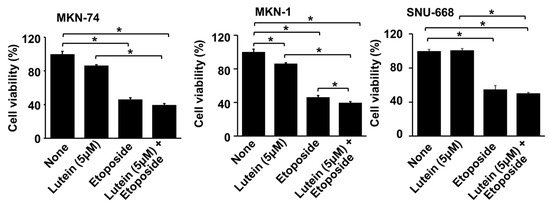 2.6. Lutein (5 μM) Increases Etiposide-Induced Cell Death in MKN-1 Cells