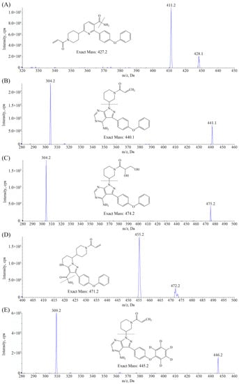 Product ion spectra of [M + H]+ and structures of (A) ORE, (B) IBR, (C) DIH, and (D) ZAN. (E) IBR-d5.