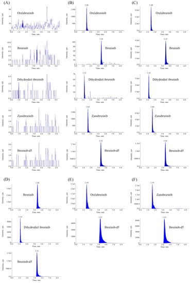 Representative MRM chromatograms of ORE, IBR, DIH, and ZAN in human plasma. (A) Blank plasma sample; (B) Plasma spiked with analytes at LLOQ and IS; (C) Plasma spiked with analytes at ULOQ and IS; (D) Plasma sample obtained from a patient at 1.5 h after oral administration of 420 mg IBR tablets; (E) Plasma sample obtained from a patient at 1.5 h after oral administration of 150 mg ORE tablets; (F) Plasma sample obtained from a patient at 1.5 h after oral administration of 160 mg ZAN tablets.