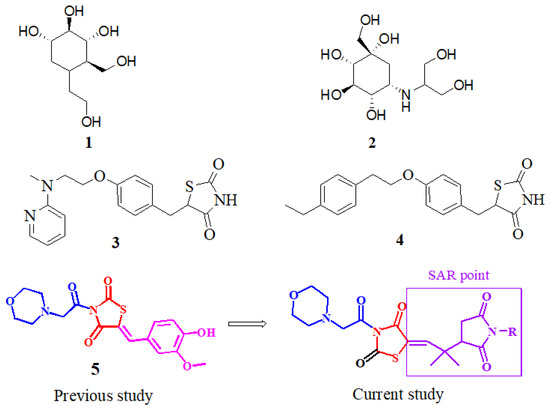 Miglitol (1), voglibose (2), rosiglitazone (3), pioglitazone (4), previously reported compound (5), and our currently designed compounds.