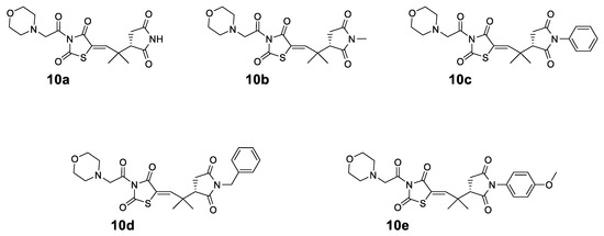 The structures of the synthesized compounds 10a–e are shown in Figure 2. In all the synthesized compounds 10a–e, the common nucleus is a morpholine connected with acetyl-thiazolidinedione and a quaternary dimethyl group to N-substituted succinimides.
