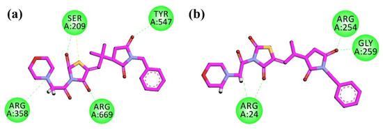 Succinimide, chemically a pyrrolidinedione, has a close structural resemblance with the five-membered antidiabetic class of the compounds thiazolidinediones [32,33]. Pyrrolidinedione has been reported to have potential pharmacological activities [34,35,36,37]. Thiazolidinedione and its analogues have been proved to be potential antidiabetic compounds [25]. Similarly, previously, pyrrolidinedione has also been reported to possess a strong antidiabetic effect [38,39]. Moreover, chiral succinimides have already been reported to have a number of potential cardio and hepatoprotective activities [40]. Chiral compounds with absolute stereo purity have also been reported recently with a strong antidiabetic activity [41]. Morpholine analogue on thiazolidinedione has also been reported to have an antidiabetic potential [31]. In this research, we combined a chiral pyrrolidinedione (succinimide) moiety with thiazolidine derivatized with a morpholine unit. The multiple functionalities and double resemblance of the designed compounds mean that more potential antidiabetic compounds can be seen in the in vitro PTP1B and DPP4 results. As can be seen in Figure 1, we have obtained different N-substitution on our designed compounds (10a–e). All these compounds have possibly different interactions with the homology model of glucosidase and the target proteins of (from PDB) of alpha-amylase, PTP1B, and DPP4. The molecular docking studies (MOE) enable medicinal chemists to predict the biding mode of any compound with the minimized protein structure for the onset of different pharmacological activities [42,43,44]. Based on our in vitro results, we observed that the compound 10d is a strong antidiabetic agent. Based on this scientific evidence, we docked the compound 10d in the homology model (alpha-glucosidase) and protein structures (from PDB) of alpha-amylase, PTP1B, and DPP4. So, the compound 10d with a benzyl substitution on the pyrrolidinedione ring with thiazolidinedione and morpholine moieties in its structure proved to be a new potential antidiabetic drug.