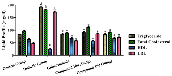 The effects of the tested compound and standard drug glibenclamide on the serum lipid profiles of the diabetic animals are displayed in Figure 6. The administration of glibenclamide and the test compound 10d to the diabetic rats exhibited a significant decline in the total cholesterol level, triglyceride, LDL in the serum as compared to that of the diabetic control group. Although, the HDL level was greater than before in the groups treated with the tested compound 10d and the standard drug evaluated to the diabetic control group.
