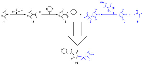 The synthetic approach for the target compounds’ synthesis is shown in Scheme 1. Initially, the thiazolidine-2,4-dione 1 was protected with bromoacetyl bromide 2 to obtain bromoacetyl-thiazolidinedione 3. The compound 3 was then protected with morpholine 4 to obtain the target thiazolidinedione hybrid 5. On the other hand, the Michael product 9 was synthesized by reacting isobutyraldehyde 6 with maleimide 7 (maleimide for 10a, N-methylmaleimide for 10b, N-phenylmaleimide for 10c, N-benzylmaleimide for 10d, and N-4-OMephenylmaleimide for 10e). As a final step, the Michael product 9 was reacted with morpholine–thiazolidine hybrid 5 to produce the final compounds 10a–e.