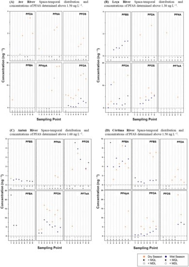 PFOS and PFOA were frequently detected in both sampling campaigns due to their high persistence and extensive use in the past: 40.6 and 41.2% and 82.4 and 97%, for PFOS and PFOA, during the dry and wet seasons, respectively. On the other hand, during the wet season, 74% of the samples presented PFBS and PFBA (another short-chain PFASs) was the compound quantified at the maximum concentration, with 22.6 ng L−1 detected in the Antuã River. The rivers presenting the highest levels of contamination by PFASs over the year were Cértima and Antuã, which are impacted by industries such as ceramics, metal-processing, footwear, textile, paper production and chemicals. The mean values of the sum of investigated compounds in all the sampling sites and both campaigns, were 15.9 ng L−1 for Cértima and 12.0 ng L−1 for Antuã. In addition, in the latter, the mean values of PFASs during the dry season were almost double the values of the wet season due to the dilution effect in the rainy period. However, in the wet season, PFBA and PFBS were the most frequent compounds, and they were detected in sampling sites 1, 2 and 3 but not in these sites during the dry season. Although the Cértima River is tagged as one of the most polluted rivers in Europe due to intense industrial and urban activities, in the present study the Ave River basin presents a mean value of the sum of PFASs of 9.5 ng L−1, along the river during both sampling campaigns. However, substantial differences can be highlighted in the dry and wet seasons, with 17 and 1.9 ng L−1, respectively. The point source pressures in the Ave are the most dominant threat to water quality in this river basin.