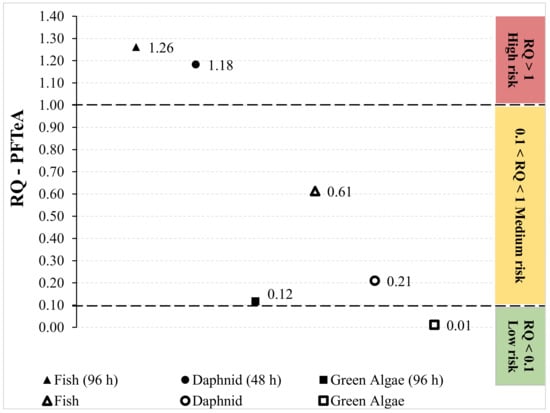 Risk assessment of the higher detected concentration of PFTeA (i.e., Antuã river at SP3 in dry season). The different symbols represent the RQ values for the different organisms and types of toxicity (acute—bold symbols and chronic—open symbols).