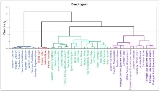 Hierarchical cluster analysis of different studies of PFASs in European SWs. The four river basins of this study are indicated in bold type. References: Sweden [57]; Ireland [56]; Austria [34]; France—Survey along the country [20]; Spain—Guadalquivir and Ebro [58]; Spain—Jucar [59]; France—Rhône and Rhine [46]; The Netherlands [60]; France—Orge [38]; UK—Thames [61]; Spain—Llobregat [62]; Italy [33]; Germany [63]; Malta [64]; Finland—[37].
