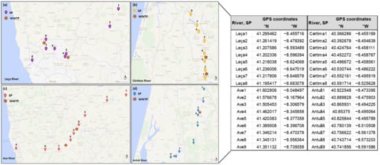 SW samples of four stressed rivers located in Portugal with no crosslinking between them (Ave River, Leça River, Antuã River, and Cértima River; Figure S1) were collected in two different sampling campaigns, namely in the dry (September 2016) and wet (February 2017) seasons. Eight sampling points (SPs) were carefully selected for Leça River and Cértima River and nine SPs for Ave River and Antuã River (Figure 4). These SPs include strategic areas (i.e., near the contamination points that are used for urban, agricultural, or WWTP activities) and close to the source and mouth of each target river. A detailed description of each river can be found in our previous work [50].