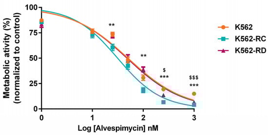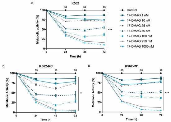 Effect of alvespimycin in metabolic activity of K562, K562-RC, and K562-RD cells. Cells were incubated in the absence of, and in the presence of, different concentrations of alvespimycin for 48 h. The curves represent the behavior of each cell line to increasing doses of HSP90 inhibitor. The results were expressed in percentage (%) normalized to control (cells treated with drug solvent) and represent the mean ± SEM obtained from 6 independent experiments. ** p < 0.01, *** p < 0.001 (comparison of K562-RC with K562); $ p < 0.05, $$$ p < 0.001 (comparison of K562-RD with K562).