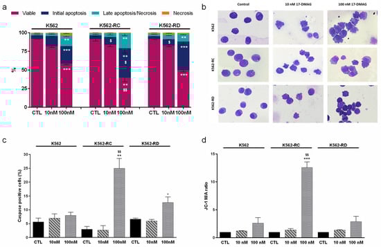 Analysis of cell death induced by alvespimycin in imatinib-sensitive (K562) and imatinib-resistant (K562-RC and K562-RD) CML cell lines. (a) The type of cell death was identified by annexin V/7-AAD staining and analyzed by flow cytometry; data were expressed as a percentage (%) of live, early apoptotic, late apoptotic/necrosis, and necrosis. In (b), cell morphology was analyzed in smears stained with May–Grünwald–Giemsa (amplification: 500×). In (c), the caspase expression levels were analyzed using the Apostat probe, and in (d), the ΔΨmit was analyzed using JC-1 fluorescent probe. JC-1 probe coexists in monomeric (M) or aggregate (A) forms depending on the mitochondrial membrane potential. The ratio between M/A JC-1 forms expresses ΔΨmit results. The results were obtained after 48 h of incubation and represent mean ± SEM of three independent experiments. Control (CTL) corresponds to cells with drug solvent (DMSO). * p < 0.05, ** p < 0.01, *** p < 0.001 (comparison with respective cell line control); $ p < 0.05, $$ p < 0.01 comparing with the same condition of sensitive K562 cells.