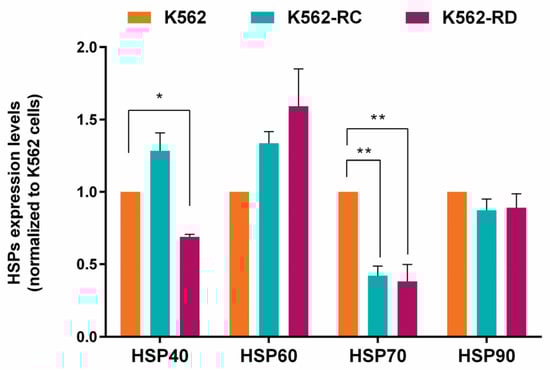 Heat shock proteins (HSP) baseline expression in imatinib-sensitive and imatinib-resistant CML cell lines. The densitometric analysis was performed using ImageJ software, and the values obtained represent the ratio between the immunodetected protein and the loading control (α-Tubulin). The results are normalized to imatinib-sensitive cells (K562) and are expressed as the mean ± SEM of 3 independent experiments. * p < 0.05, ** p < 0.01 comparing with K562.
