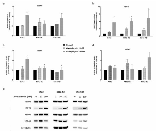 The same protein expression analysis was performed after 48 h of incubation with alvespimycin (Figure 5). In general, this drug induced a dose-dependent increase in HSPs expression in all cell lines. In imatinib-sensitive cells, the treatment with 100 nM of alvespimycin induced a 2×-fold expression of HSP90 (p < 0.05; Figure 5a), 5×-fold expression of HSP70 (p < 0.05; Figure 5b), 2×-fold expression of HSP60 (p < 0.05; Figure 5c), and a slight increase in HSP40 expression (Figure 5d), compared to control cells. Similar behavior was denoted in resistant cells, where the differences in HSP70-1 were more pronounced with a significant increase of 5×- and 7.5×-fold more expression in K562-RC (p < 0.05) and K562-RD (p < 0.05), respectively, compared with untreated cells. Additionally, we observed differences in the effect of 100 nM of alvespimycin across the three cell lines for the HSP60 expression, being lower in imatinib-resistant cells compared to K562 ($ p < 0.05).