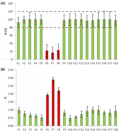 Figure 2. Toxicity of the fractions obtained in the first fractionation at REF 0.3. (A) Size increase (%) response of the fractions and (B) index of toxicity (IT) response of the fractions based on larvae malformations. Green colored bars refer to non-toxic fractions, while red bars refer to the identified toxic fractions. Error bars correspond to the standard deviation (SD) of the three replicates. Red dotted lines represent normal larvae SI (%) range (80–120%).