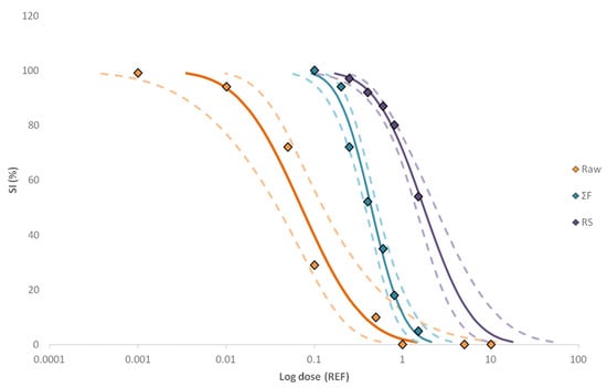 Figure 1. The log dose–response curves of raw (hospital effluent) and RS samples obtained with SI endpoint (%). Continuous lines show the effect concentration (EC) fit values obtained with PROBIT and dashed lines indicate the confidence level (95%). Error bars correspond to the standard deviation (SD) of the three replicates.